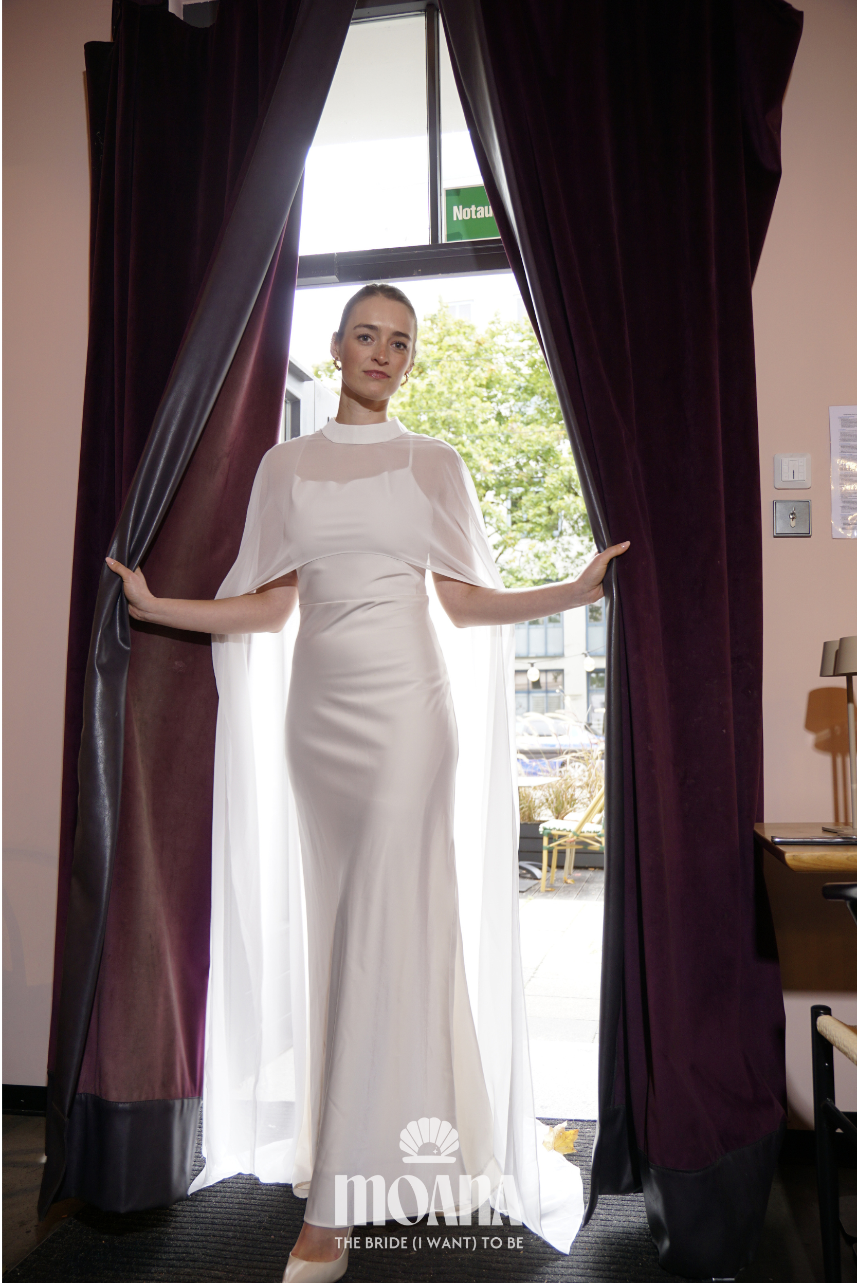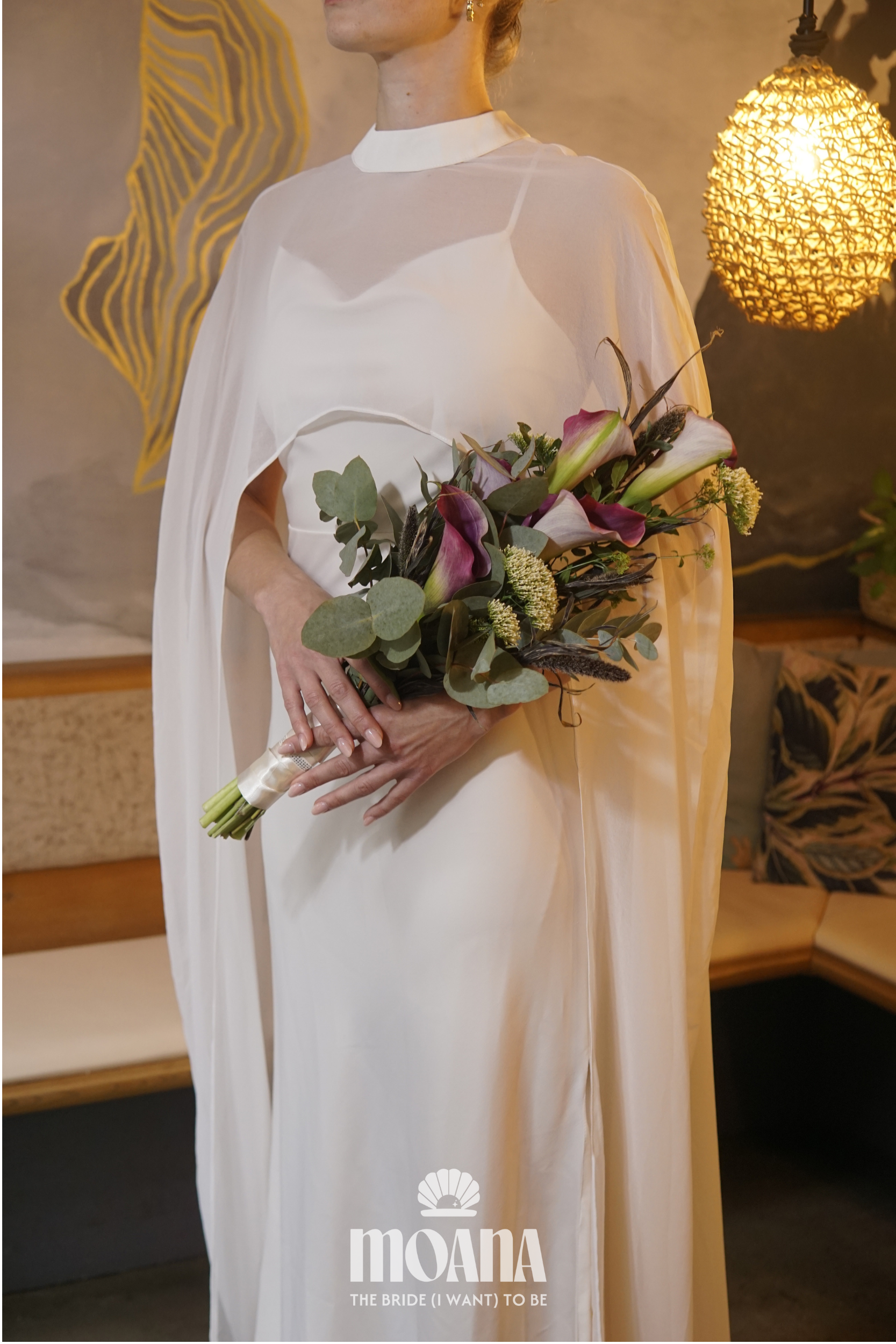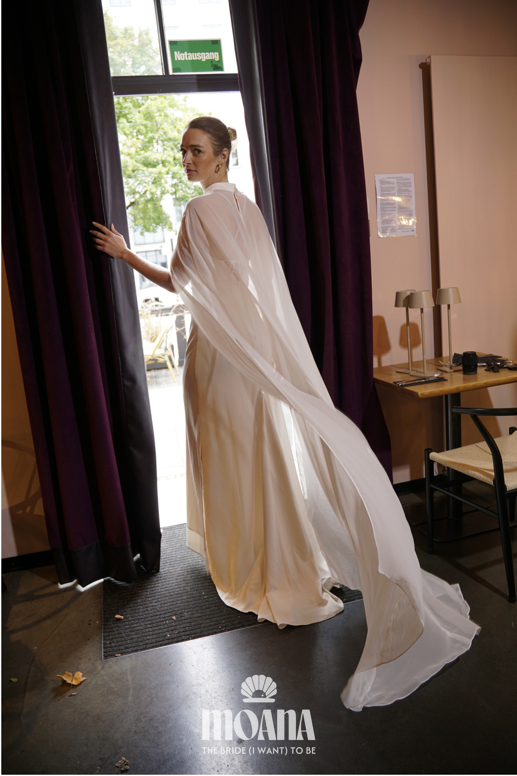 Das HOKELE Cape ist wie geschaffen für Bräute, die klassische Elemente neu interpretieren und mit einem cleanen, modernen Design Akzente setzen möchten. Mutig, minimalistisch und zugleich voller Emotion: ein Accessoire, das Stärke und Stil vereint.